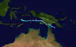 That night and into the early hours of the 27th, the storm caused havoc on Budibudi Island. All coconut trees – including those on adjacent islands – were flattened. Food crops on a nearby island used for agriculture were ruined by the surges. Several buildings were destroyed by Upia, although no fatalities were reported.[27] The cyclone remained quasi-stationary for many hours until it began drifting south-southeastward. Port Moresby increased their intensity estimates for the system, reporting peak winds at 65 km/h (40 mph) while JTWC estimated the system was considerably weaker. On 28 May JTWC issued their final warning on the system. Port Moresby issued their last warning that day as well. The system was downgraded to an ex-tropical cyclone by TCWC Brisbane when it drifted toward their region.[26]