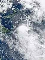 A monsoon trough present near the equator spawned a low near eastern New Guinea. The system tracked westward at a very low latitude. Convection rapidly built around the system because of its position near the axis of the ridge and the low vertical wind shear in the environment. The storm was mentioned by TCWC Darwin in the daily Tropical Weather Outlook on 15 November and given a low to moderate chance of developing into a tropical cyclone within 72 hours.[3] On 17 November, tropical depression formed near southern Papua New Guinea.