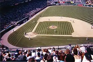 ![]() Yankees' fielders huddling on the pitcher's mound during an August 2001 away game | ||