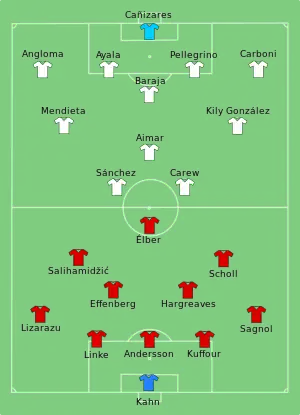 Again, Valencia took the lead early on as Paulo Sérgio put the first kick of the shoot-out over the bar before Mendieta sent Oliver Kahn the wrong way. Hasan Salihamidžić, John Carew and Alexander Zickler then traded penalty goals before Kahn saved Zlatko Zahovič's kick to tie the scores at 2–2 after three kicks each. The next kick from Patrik Andersson was also saved by Cañizares, and then Kahn stretched out a hand to tip Amedeo Carboni's shot onto the crossbar. Both Rubén Baraja and Stefan Effenberg then scored to take the shoot-out to sudden death. Bixente Lizarazu and Kily González both scored their clubs' sixth kicks of the penalty shoot-out, and then Thomas Linke scored for Bayern to set Mauricio Pellegrino up for the game-deciding kick. Kahn guessed the right direction and saved Pellegrino's kick, winning the cup for Bayern Munich.[4]
