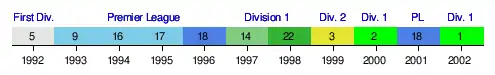 Prior to this season, the history of Manchester City's performance in the English football league hierarchy since the creation of the Premier League in 1992 is summarised by the following timeline chart–which commences with the last season (1991–92) of the old Football League First Division (from which the Premier League was formed).