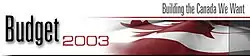 The Canadian federal budget of 2003 was unveiled on February 18, 2003. It was the first budget issued by Finance Minister John Manley who was given the job in May 2002 replacing Paul Martin. It was also the last budget of Prime Minister Jean Chrétien.