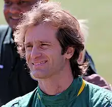 Ralf Schumacher stayed on the track for one extra lap due to a radio miscommunication with his team.[85][86] He lost traction on the wet grass and crashed backwards into the turn eight tyre barrier.[77][78] He retired the car with rear suspension damage on the turn's run-off area.[78][80] Webber's visibility was limited due to his visor steaming up, and he lost control of his Jaguar on dry tyres.[75][86] He hit the turn eight tyre barrier with his car's front and retired.[78] Montoya served his drive-through penalty on lap 22 while Coulthard led one lap before going off the track.[81][86] Button and Frentzen gained the most from the rain since they had switched to rain tyres at their first pit stops and held first and second,[81][85] with Michael Schumacher gaining on the leaders.[89] On lap 23, Montoya went off the circuit at turn eight and onto the grass before another pit stop for the full rain tyres, dropping to 11th.[78][80][81] Button began pulling away from Frentzen in second as the Bridgestone tyres outperformed the Michelins in the wet. Wilson dropped from third to sixth in three laps when Räikkönen, Michael Schumacher and Alonso passed him.[78][81][89]