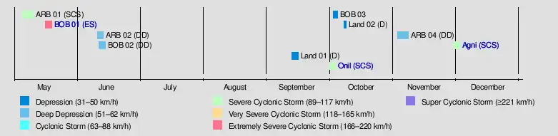 The monsoon became active in May as water temperatures became warm.[3] Twin depressions formed during June on opposite sides of India, which helped intensify the monsoon over the country. A notable feature of the season was the Arabian Sea being more active than the Bay of Bengal.[1] The IMD began naming tropical cyclones within the basin in 2004, beginning after the monsoon season. As such, only two cyclonic storms in the latter half of the year were named.[1]