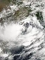 The second storm of the season formed as a depression on May 16 in the central Bay of Bengal. With low wind shear and a surge in the monsoon trough, the storm intensified while meandering over open waters. The storm eventually began a steady northeastward motion due to a ridge to the north over India. While approaching land, an eye developed in the center of the storm, indicative of a strong cyclone. On May 19, the cyclone made landfall along northwestern Myanmar near Sittwe, with maximum sustained winds estimated at 165 km/h (105 mph) by the IMD.[1][2][4] The storm rapidly weakened over land, although its remnants spread rainfall into northern Thailand and Yunnan province in China.[4]