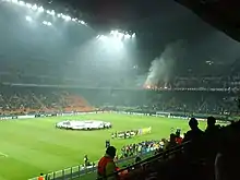 Milan were drawn against German team Bayern Munich in the quarter-finals. The first leg at the San Siro ended in a 2–2 draw after Bayern had scored an equaliser three minutes into stoppage time.[11] The second leg at Bayern's home ground the Allianz Arena was more comfortable for Milan, as they scored two first half goals to win the match 2–0 and win the tie 4–2 on aggregate. Milan were drawn against English team Manchester United in the semi-finals. The first leg at United's home ground Old Trafford, Kaka scored twice to give Milan a 2–1 lead after Cristiano Ronaldo had scored an early goal. However, two goals from Wayne Rooney in the second half meant United won the first leg 3–2.[12] The second leg at the San Siro saw Milan win 3–0 to progress to the final after a 5–3 aggregate victory.[13]