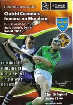 The 2007 Munster Senior Hurling Championship Final was a Hurling match played on 8 July 2007 at Semple Stadium, Thurles, County Tipperary. It was contested by Limerick and Waterford. Waterford claimed their third Munster Championship of the decade, beating Limerick on a scoreline of 3-17 to 1-14, a 9-point winning margin.[1] Overall, this was Waterford's eighth Munster Senior Hurling Championship.