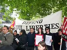 On 3 November 2007, a demonstration involving about 150 people took place outside a Labour Party conference. Some protesters wearing orange boiler suits had chained themselves together with gags in their mouths and a word such as "terrorist", "Māori" or "anarchist" on their backs. Others held placards with the slogans "State terrorists kidnapped our friends" and "Free political prisoners".[103] Len Richards, a Labour Party delegate allegedly struck a protester in the face with a megaphone, though he claimed "there was no violence" despite TV3 showing footage of the incident.[104] According to the Workers Party, the protester was one of their members.[105] Three men were arrested at the protest: the first was attempting to break the police line and enter the conference venue, the second was pulled off the top of a police van and a third was arrested from within the crowd. Security personnel at the venue had been significantly increased from the previous day.[103]