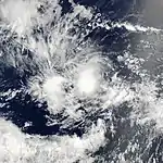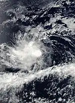 A tropical wave emerged off the western coast of Africa on July 16. Tracking westward, intermittent bursts of deep convection occurred as it crossed the Leeward Islands on July 22, but associated activity remained disorganized. The wave crossed Central America three days later, emerging into the eastern Pacific Ocean shortly thereafter. On July 28, a broad area of low pressure formed along the wave axis; easterly shear, however, prevented thunderstorms from developing over the center. Convective activity increased by July 31, leading to the formation of a tropical depression at 1200 UTC that day.[38] Despite the unfavorable environment, satellite intensity estimates increased to tropical storm intensity, prompting the National Hurricane Center to upgrade the depression to such.[39] After attained a peak intensity with winds of 40 mph (65 km/h) and a minimum barometric pressure of 1004 mb (hPa; 29.65 inHg) at 0600 UTC on August 1, continued wind shear caused Erick to weaken to a tropical depression. The low-level center became lost organization as it became elongated northeast to southwest on August 2, leading to degeneration into a tropical wave by 0600 UTC. The remnants of the system dissipated six hours later.[38]