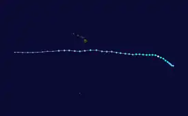 An ill-defined tropical wave entered the eastern Pacific on August 1 and steadily organized to attain tropical depression intensity eight days later. Within an environment of light shear, the depression intensified into Tropical Storm Flossie at 0000 UTC on August 9 and continued to organize to attain Category 1 hurricane intensity by 1200 UTC the following day as an eye became apparent on satellite. Continuing westward and crossing into the central Pacific basin, the system began a period of rapid intensification that brought it to its peak intensity with winds of 140 mph (220 km/h) and a minimum barometric pressure of 949 mb (hPa; 28.03 inHg) at 0000 UTC on September 12, while positioned roughly 980 mi (1575 km) east-southeast of the Big Island. Increased wind shear the next day caused Flossie to begin a slow weakening trend thereafter; at 1200 UTC on September 14, the system weakened to a Category 2 hurricane, and by 0600 UTC on September 15, the cyclone was barely a Category 1 hurricane. Six hours later, it weakened to a tropical storm as the low-level center became exposed on satellite. Flossie weakened to a tropical depression early on September 16 and dissipated by 1800 UTC.[40]