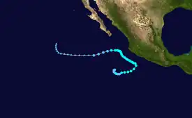 On May 24, a tropical wave emerged off the western coast of Africa. The wave entered the eastern Pacific around June 6 and shower and thunderstorm activity began to increase shortly thereafter. A broad area of low pressure formed a few hundred miles south of Acapulco, Mexico two days later.[19] Following satellite evidence of a well-defined circulation and organized convective activity,[20] the National Hurricane Center upgraded the disturbance to a tropical depression at 1200 UTC on June 11. After attaining winds of 35 mph (55 km/h) and a minimum barometric pressure of 1004 mb (hPa; 29.65 inHg), the depression began to traverse cooler waters and much more stable air. This caused all associated convection to fade away, and the depression degenerated to a non-convective remnant low at 0000 UTC on June 13. The remnant low continued northwest until dissipation by 0600 UTC on June 15.[19]