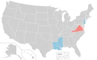 Democrats held control of both chambers of the New Jersey and Louisiana legislatures, and held control of the Mississippi House of Representatives. Meanwhile, Republicans held control of the Virginia House of Delegates. Meanwhile, Democrats gained control of the Virginia and Mississippi Senates, however, Democrats had only lost control of the latter chamber at the beginning of the year when Senators James Walley and Tommy Gollott switched parties from Democratic to Republican.[2]