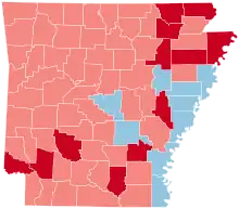 Arkansas was won by Republican John McCain by a 19.86% margin of victory, an even greater margin than George W. Bush attained in 2004, despite the national Democratic trend. This was likely due to the issue of race in the presidential election.[1] Prior to the election, all 17 news organizations considered this a state McCain would win, or otherwise a red state. The state trended dramatically Republican in 2008, as McCain received over 4% more of the statewide popular vote than Bush earned in 2004 and more than doubled his margin of victory. Only five counties swung more Democratic in 2008, and the vast majority of counties swung heavily Republican, some by as much as 30%.[2] Of the ten counties with the largest percentage swing to the Republicans in the U.S. during this election, six of them were located in Arkansas.[3]