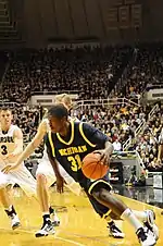 Zack Novak and Stu Douglass led the Wolverines in scoring in their conference season opening 71–65 loss to Indiana on New Year's Eve.[41] Sims and Harris led the way to the first conference victory on January 3 against a #15-ranked Ohio State team without its leading scorer, Evan Turner.[42] On January 7, the Wolverines came from 16 points behind to defeat the Penn State Nittany Lions on the strength of four second half three point shots by Laval Lucas-Perry and 25 points from Sims.[43] On January 10, they wasted a 17-point lead in a loss to Northwestern despite 24 points from Harris and 17 from Sims.[44] On January 11, Sims became the second Wolverine to earn Big Ten Player of the Week for his efforts during week nine (January 4–10).[45] The Wolverines won the January 14 rematch against Indiana under the leadership of Harris who had 17 second half points and Sims who added 20 points and 8 rebounds.[46] Michigan then earned its first win against a ranked non-conference opponent and their second consecutive win against a ranked opponent on January 17 when it defeated #15 Connecticut 68–63 behind 18 points and 8 rebounds from Harris.[47] Subsequently, they lost three consecutive games to ranked conference opponents. On January 20, Michigan opened up a lead on Wisconsin who missed its first eight field goal attempts. They led until Wisconsin tied the game with 4 minutes and 4 seconds remaining. Wisconsin scored two subsequent baskets to take the lead. Wisconsin held on despite 23 points and 13 rebounds from Sims.[48][49] On January 23, while Manny Harris served a one-game suspension, Sims posted 21 points and Novak added 16, but after taking an 11–10 lead, the Wolverines surrendered a 16–2 run to Purdue that they never recovered from.[50] On January 26, the Wolverines hosted Michigan State who needed a Kalin Lucas basket with 3.5 seconds to play to earn the win, which resulted in Michigan state posting a school-record eight consecutive conference victories to start conference play.[51] On January 30, Michigan finished the month with a 60–46 win against Iowa to snap its three-game losing streak. Harris and Sims both contributed 20 points. Sims had 12 rebounds as well. Michigan scored the first 13 points of the game and after taking a 12-point lead into halftime, they scored the first 5 points of the second half.[52]