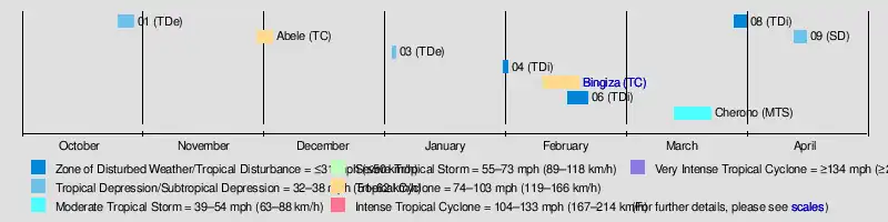 | 9 systems | 25 October – 16 April | 155 km/h (95 mph) | 957 hPa (28.26 inHg) | Unknown | 34 | |||