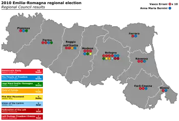 Errani (–10.6% compared to 2005) and the Democrats (–7.7%) lost ground to the Five Star Movement, whose candidate won a surprising 7.0% of the vote, in what was the worst result for the centre-left in a regional election in Emilia–Romagna. The other surprise of the election was Lega Nord, which gained 13.7% of the vote, up from 4.8% in 2005.