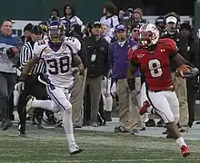Davin Meggett (right) carrying the ball for Maryland during the 2010 Military Bowl