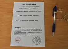 Presidential elections were held in Poland on 20 June 2010. As no candidate received a majority of votes in the first round, a second round was held on 4 July 2010.[1] Bronisław Komorowski, the acting President of Poland and vice-chairman of the Civic Platform, defeated Jarosław Kaczyński, twin brother of recently deceased President Lech Kaczyński and chairman of Law and Justice. The global financial crisis, flooding in Poland and the Smolensk disaster were the main themes in the last months of the election campaign.
