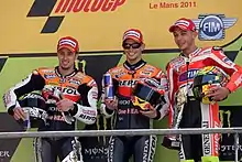 Andrea Dovizioso, Casey Stoner and Valentino Rossi, celebrating on the podium after finishing second, first and third at the MotoGP race.