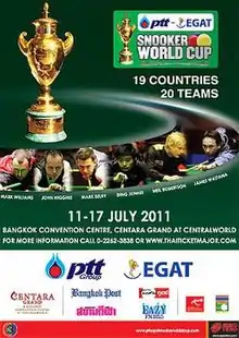 9. 1 2 3 4 5 "PTT-EGAT .Snooker World Cup". Thai Ticket Major. Retrieved 19 June 2011.