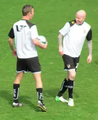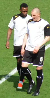 With the club's new owner in place, Adams signed six players early in July. He first signed midfielder Darren Murphy and winger Jennison Myrie-Williams (who had impressed in a loan spell at the club the previous season) from Stevenage, as well as Colchester United attacker Ashley Vincent.[2] He then made another triple swoop by bringing in Shrewsbury Town goalkeeper Chris Neal, Crewe Alexandra centre-back David Artell, and former Wales international Richard Duffy.[3] Highly rated striker Liam Dickinson, veteran forward Darren Byfield, and Irish attacker Tadhg Purcell also joined the club on trial.[4][5][6] Adams appointed Doug Loft as club captain at the end of July.[7] The pre-season tour of Ireland was hailed as a success, whilst Vale recorded wins in each of their encounters with non-League opposition.[8] However, David Artell left the club as a free agent days before the start of the season, as he refused to sign a contract that reflected the club's status as 'in administration' (the initial contract he signed listed Keith Ryder as the club's owner, and was therefore invalid).[9]