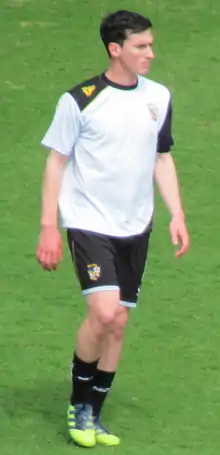 October opened with a dismal home draw with Dagenham & Redbridge, with goalkeeper Chris Neal making an uncharacteristic error to allow a blunted "Daggers" attack to claim an unlikely goal.[11] The team then rallied to produce a convincing 2–0 win away at fourth-placed Exeter City, Pope's two goals taking him into double figures with 35 league games yet to play.[11] However, injuries took hold of the small squad, with captain Loft sidelined with a calf injury,[14] and winger Lewis Haldane forced to announce his retirement after failing to recover from a broken leg he sustained in August 2011.[15] They played Oxford United on a Monday night in front of the Sky Sports cameras, and did themselves justice with a convincing 3–0 win, with both Ashley Vincent and Sam Morsy scoring impressive goals.[11] An injury/suspension crisis in midfield then did little to prevent a patched up Vale side to come from behind to beat Gareth Ainsworth's Wycombe Wanderers 4–1.[11] They then travelled to Staffordshire rivals Burton Albion, and battled to a 1–1 draw after falling behind to a fluke goal.[11] The month ended on a sour note at Sixfields, as John McCombe was sent off after breaking the leg of Northampton Town goalscorer Alex Nicholls; injuries and suspensions left teenagers Joe Davis and Kingsley James to form a makeshift centre-back partnership, though the score was kept to a respectable 2–0.[11] For a second-successive time, a Vale player was named the division's Player of the Month; Ashley Vincent took the award, but credited his teammates, saying "this award is as much for them as it is for me".[16]