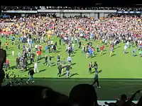 Vale were holding onto second place going into April, and though they failed to capitalize on their rivals dropping points on 1 April, they managed to come from behind to two Marc Richards goals at Chesterfield to secure a point. Four days later, Vale hosted fourth placed Burton Albion, in what was labelled as the biggest game of the season for the "Valiants".[41] Reduced tickets of £9 ensured a crowd of 10,978, and they were treated to a comprehensive 7–1 victory as Lee Hughes scored a hat-trick.[42] Bottom-placed Aldershot were the visitors four days later, and were seemingly fired up after manager Andy Scott took offense to Adams saying that "[Aldershot] are down the bottom because [they] deserve to be"; Scott stated that "Sometimes managers say things to deflect from what is going on at their own club. We will find out if they have got the stomach for the fight and see if they want to get promoted as they have got a few clubs chasing them."[43] The match proved to be low on action, and Vale surrendered a half-time lead to draw the game 1–1. On 12 April, it was confirmed that Burge had left the club by mutual consent.[44] Vale could have won promotion the following day, and seemed to have done so after Liam Chilvers made amends for a horrific first half own goal by heading Vale into the lead on 89 minutes; however, an injury-time equaliser left the Vale still just short of their final target. Automatic promotion was effectively secured with a 2–2 draw against Northampton Town on 20 April, the two unlikely goalscorers were Chilvers and former "Valiant" turned "Cobbler" Lee Collins. Promotion was confirmed with a 1–1 draw with Wycombe at Adams Park on the last day of the season, in what was former favourite Gareth Ainsworth's last game as a player.