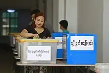 The Union Solidarity and Development Party said it would lodge official complaints to the Union Election Commission on poll irregularities, voter intimidation, and purported campaign incidents that involved National League for Democracy members and supporters.[30][31] The National League for Democracy also sent an official complaint to the commission, regarding ballots that it claimed had been tampered with wax.[32]