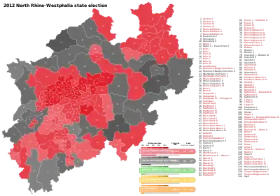 In the 2010 state election, the CDU held a 0.1% lead over the SPD, though both parties won 67 seats. The SPD and Greens emerged one seat short of a majority, while the CDU and FDP were 10 seats short. This was due to the new presence of The Left. After failed negotiations with The Left, the SPD and Greens formed a minority government with SPD leader Hannelore Kraft as Minister-President.[3] The state budget was rejected by the Landtag on 14 March 2012.[3][4] The government expected the FDP to abstain from the vote, allowing it to pass.[5] However, the CDU, FDP, and Left all voted against the budget, and it was rejected.[4] This led to the dissolution of the Landtag and a snap election.