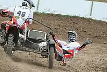 The Sidecarcross World Championship, first held in 1980 and organised by the Fédération Internationale de Motocyclisme, is an annual competition. All races, manufacturers and the vast majority of riders in the competition being in and from Europe.[1][4] Sidecarcross is similar to motocross except that the teams consist of two riders, a driver and a passenger. Races are held on the same tracks as solo motocross but the handling of the machines differs as sidecars don't lean. The majority of physical work in the sport is carried out by the passenger, who speeds up the sidecarcross in corners by leaning out. The coordination between the driver and the passenger are therefore of highest importance.[6]