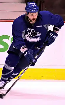 With a shrinking salary cap the Canucks had limited funds to sign new players.[11] Vancouver could not afford to pursue top end free agents like Jarome Iginla or Nathan Horton.[12] Instead they signed less costly restricted free agents Dale Weise, Jordan Schroeder, Kellan Lain and Christopher Tanev,[13][14] as well as unrestricted free agent players Brad Richardson, Yannick Weber and Mike Santorelli.[15][16] The Canucks also signed unrestricted free agent Andrew Alberts, after his previous contract with the Canucks had expired at the end of the 2012–13 season.[17] Richardson was brought on as center for one of the bottom two lines in a checking role, and to provide the team with another reliable face-off man.[18] Alberts and Weber were competing in the pre-season for the sixth defenceman spot. Weber was also seen as a possible power play contributor as a right-handed defenceman with a hard shot, potentially playing a role similar to that of former Canuck Sami Salo.[19] Santorelli was not expected to make the team initially, but would add depth to the Canucks new American Hockey League (AHL) affiliate, the Utica Comets instead.[20]