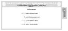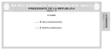 ![]() Claudio Orrego (PDC) | ![]() PDC primary ballot. A primary was held on 19 January 2013 to determine the Christian Democratic Party's pre-candidate for the presidency. This primary was organized by the party and not under the new primary law. The contenders were Claudio Orrego and Ximena Rincón. Orrego won the primary with 59% of the vote.[17]