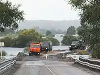 From the end of July to mid-August 2013, unusually heavy rainfall occurred near the Amur River, which marks the dividing line between China and Russia. Starting on August 10, 2013, areas of northeastern China began to experience flooding.[7] From August 15 to 17, heavy rainfall worsened the problem, causing the worst flooding in the region in more than a decade.[4][8] Nankouqian Township, one of the hardest-hit areas, saw 44.9 centimetres (17.7 in) of rain, half the average annual total, on August 16 alone.[9] By August 18, water levels at 61 reservoirs surpassed the "danger" level. Fushun city in the Liaoning province was especially hard hit as rainstorms caused several rivers in the city to overflow.[8] Across the border in eastern Russia, heavy flooding was also reported, with Amur Oblast, Jewish Autonomous Oblast and Khabarovsk Krai the hardest hit.[7] More than 140 towns were affected by what Russia authorities described as the worst flooding in 120 years.[10] The Amur River reached a record 100.56 metres (329.9 ft), surpassing the previous record set in 1984, and was still rising as of August 19, threatening to flood the major city of Komsomolsk-on-Amur.[9][10]