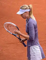 Maria Sharapova began her year at the Australian Open as the second seed, dropping a record-low nine games en route to the semifinals, where she lost to Li Na in straight sets.[27] She won her first title of the year at the BNP Paribas Open defeating Caroline Wozniacki in the final.[28] She followed it up with a final appearance at the Sony Open Tennis where she lost to Serena Williams.[8] She began her clay-court season campaign with a successful title-defense in Porsche Tennis Grand Prix over Li.[29] She followed it up by reaching the final of Mutua Madrid Open, once again losing to Williams.[10] Coming as the defending champion of the French Open, Sharapova reached the final but lost for the fourth time in the season to Williams in straight-sets.[12] Seeded second at Wimbledon, she lost in the second round to Michelle Larcher de Brito.[30] Sharapova withdrew from the US Open, Toray Pan Pacific Open, and China Open due to a right shoulder injury.[31][32] However, Sharapova withdrew from the championship due to a right shoulder injury.[33]