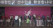 The ceremony started with a few introductory performances. The first one, featuring a little girl named Kim Min rolling a hoop across the main stadium to actor Jang Dong-Gun who in turn gave the hoop back to her,in a act that remembered the 1988 Summer Olympics opening and closing ceremonies,the “Hoop Boy and Girls” performances.[14] Kim is a young rhythmic gymnast attending Incheon Cheongil Primary School who hoped to represent Korea in the 2020 Summer Olympics. She was later joined by 44 other hoop-rolling children from various schools to represent the 45 participating nations of the games as well as the population of the Asian continent of 4.5 billion. In the second one, a few women dancers in traditional costume gathered at the center of the stage to form Cheongsachorong, a traditional Korean lantern to mark the arrival of notable guests including Park Geun-hye, then the President of South Korea. The third performance featured soprano Sumi Jo who sang "The Song of the Asiad," dedicated by poet Ko Un, along with Incheon Metropolitan Citizens Choir, a choir consisting of 919 residents of the host city symbolising the event's opening date. The performance was composed by Kim Youngdong, a representative composer for traditional music of Korea.[15] At the end of the performance, Sumi Jo sang the Korean traditional folk song Arirang with 10-vocalist choir.[16][17] Before the start of the main performance, a video of the 2014 Asian Games torch relay was played with British band Coldplay's single, Viva la Vida as background music.