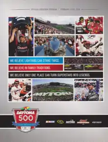 Daytona International Speedway is one of six superspeedways to hold NASCAR races, the others being Michigan International Speedway, Auto Club Speedway, Indianapolis Motor Speedway, Pocono Raceway, and Talladega Superspeedway.[18] The standard track at Daytona International Speedway is a four-turn superspeedway that is 2.5 miles (4.0 km) long.[19] The track's turns are banked at 31 degrees, while the front stretch, the location of the finish line, is banked at 18 degrees.[19] Jimmie Johnson was the defending race winner.
