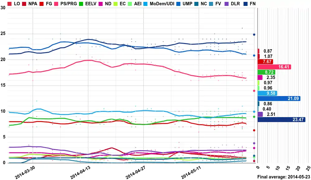 The 2014 European Parliament election in France for the election of the 8th delegation from France to the European Parliament took place on 24 May 2014 in the overseas territories of France, and on 25 May 2014 in metropolitan France. The number of seats allocated to France increased to 74, compared to 72 in the 2009 election, as a result of the 2013 reapportionment of seats in the European Parliament.