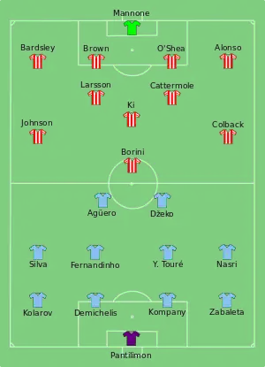 Sunderland took the lead in the 10th minute, when a ball over the top from Adam Johnson found Fabio Borini, who held off the challenge of Vincent Kompany before slotting the ball into the bottom right corner of Costel Pantilimon's goal. Borini was played through again later in the first half, but Kompany made amends with a successful last-ditch sliding challenge. Sunderland held their lead until half time; however, they were undone by two City goals after the break. In the 55th minute, Yaya Touré curled the ball into the top-right corner of Vito Mannone's goal from 25 yards out, and almost immediately from kick off City attacked again, with Samir Nasri firing home from the outside of his boot from a deflected Aleksandar Kolarov cross, leaving Mannone standing. Sunderland pressed for an equaliser, with substitute Steven Fletcher wasting a last-minute chance by failing to control the ball, before Jesús Navas finished off a swift City counter-attack in stoppage time to seal their first League Cup win since 1976.[24]