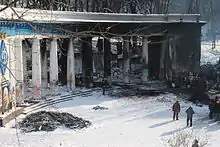 Entrance to the Dynamo Stadium near Hrushevskoho Street on fire on 19 January 2014