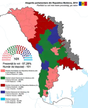 Parliamentary elections were held in Moldova on 30 November 2014. The result was described as "more a loss than a victory" of the incumbent pro-European coalition, with center-right parties divided by sharp tensions.[1] The pro-Russian Party of Socialists (PSRM), composed of former communists, emerged as the largest party in Parliament, gaining 20.51% of votes and winning 25 of the 101 seats. The Party of Communists of the Republic of Moldova (PCRM), previously the largest party, dropped from 38 to 21 seats.