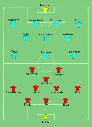 Both sides had opportunities to open the scoring, and Chilean goalkeeper Claudio Bravo made a close-range save from Sergio Agüero, who had been set up by Lionel Messi. However, soon afterwards, Argentina made the first substitution due to a hamstring injury, with Ángel Di María making way for Ezequiel Lavezzi. Chile finished the first half with three yellow cards, while Argentina had none.[6]