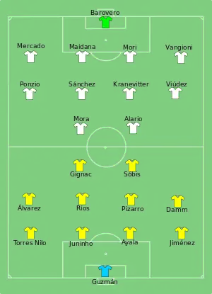 River opened the scoring at the end of the first half when recent signing Alario headed Leonel Vangioni's low cross from the left into the goal. At 8' Lucas Alario committed an illegal strong entry against the ankle of Guido Pizarro, foul that media later considered that deserved red card.[11][12] Alario saw yellow card. At 25', Tigres had four players with yellow card, three of them defenders.