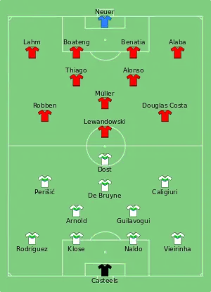 Arjen Robben had put Bayern Munich ahead in the 49th minute from close range after goalkeeper Koen Casteels had fumbled a cross from the left from Douglas Costa. Nicklas Bendtner leveled the game in the 89th minute scoring at the near post after a cross from Kevin De Bruyne from the right. Bendtner went on to score the decisive penalty in the penalty shoot-out shooting high into the top left corner as Wolfsburg won 5–4.[4]