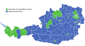 Incumbent President Heinz Fischer had served two terms and was not eligible to be elected for a third successive term. In the first round of the election, Norbert Hofer of the Freedom Party of Austria (FPÖ) historically received the most votes. Alexander Van der Bellen, a member of the Austrian Greens contesting as an independent, placed second, also a historic success for a member of the Greens. The candidates of the two governing parties, the Social Democratic and Austrian People's parties, placed fourth and fifth respectively, behind independent Irmgard Griss in third place, which led to a government crisis and the resignation of Chancellor Werner Faymann. Since no candidate received a majority of the vote, Hofer and Van der Bellen went head-to-head in the second round in May. This was the first time since the Second World War that an Austrian president had not been backed by either the People's or the Social Democratic party.[4] During the run-off, Van der Bellen defeated Hofer on 23 May 2016 after the postal ballots had been counted.[5]