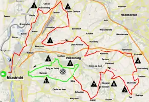 The race started on Maastricht's Markt, the city's central market square, and finished in Berg en Terblijt, covering 121.6 km. The route was made up of one bigger loop in the south of Limburg, followed by three 17.6 km loops centering around Valkenburg which featured the Geulhemmerberg, Bemelerberg and Cauberg climbs. In total, the route contained 17 categorized hills, usually short but with a varying gradient and coming in quick succession throughout the race.[1] The Cauberg was addressed four times; its last crossing was also the last climb of the day. From the top of the Cauberg, there was a 1.7 km run-in to the finish line in Berg en Terblijt.[4]
