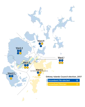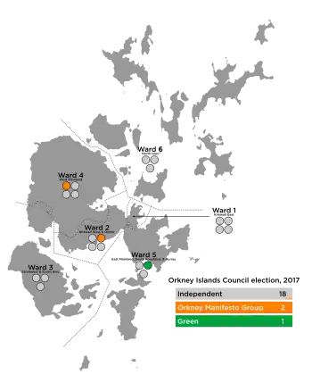 The 2017 Orkney Islands Council election took place on 4 May 2017 to elect members of Orkney Islands Council. The election used the six wards created as a result of the Local Governance (Scotland) Act 2004, with each ward electing three or four Councillors using the single transferable vote system a form of proportional representation, with 21 Councillors being elected.