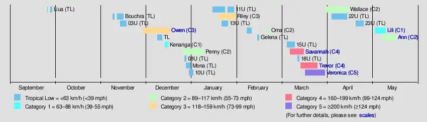 This was the first Australian tropical cyclone season since 2014–15 to feature at least six severe tropical cyclones. It was also the third season in a row to begin prior to the official commencement date of 1 November, in this instance with the development of Tropical Low Liua on 26 September 2018. The most active month was December 2018, with a total of seven tropical lows existing in the region at some time during the month. The three strongest storms of the season—Veronica, Trevor and Savannah—all developed in March 2019, and together affected all three of the Bureau of Meteorology's Australian sub-regions as severe tropical cyclones. Overall, a total of five tropical cyclones existed within each of the three sub-regions throughout the season, representing an above-average season for both the Eastern Region and the Northern Region, but a below-average season for the Western Region. The season concluded much later than usual, and well after the official ending date of 30 April. Two tropical cyclones developed during May—Lili in the eastern Indonesian archipelago and Ann in the Coral Sea—both of which made landfall as tropical lows after weakening from tropical cyclone intensity. At its peak, Ann was a Category 2 tropical cyclone, and was the strongest storm to form in the Australian region during May since Severe Tropical Cyclone Rhonda in 1997. In total, eight systems were named by the BOM during the season, with two named by the BMKG and one by the FMS.