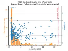 An earthquake measuring 6.6 Mw on the moment magnitude scale struck Iburi Subprefecture in southern Hokkaido, Japan, on 6 September 2018 at 3:08 a.m. JST. The earthquake's epicenter was near Tomakomai and occurred at a depth of 35.0 kilometers (21.7 mi). The Japan Meteorological Agency (JMA) registered a magnitude of 6.7 Mj and a maximum intensity of 7 on the shindo scale.[5] Shaking from the earthquake was felt strongly in Hokkaido and Aomori Prefecture, and shaking was felt as far away as the Kantō region.[6][7] Long period ground motion (LPGM) during the earthquake reached maximum of class 4 on the JMA LPGM intensity scales.[8] The earthquake disrupted electrical service throughout Hokkaido, leaving 5.3 million residents without power. Forty-one people were confirmed dead and six hundred and ninety-one were injured.[4] The event is officially known as Heisei san-jū-nen Hokkaidō Iburi tōbu jishin (平成30年北海道胆振東部地震, "Hokkaido Eastern Iburi Earthquake of Heisei 30").