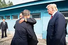 Following the conclusions of the 2019 G20 Osaka summit in Japan, on June 30, 2019, Trump and South Korean president Moon Jae-in visited the DMZ before the meeting with North Korean leader Kim Jong Un. Kim invited Trump to cross the border line, and Trump briefly crossed in North Korea before crossing back into South Korea together with Kim.[22][24] Trump thus became the first sitting U.S. president to enter North Korea.[25][lower-alpha 1] Before crossing into North Korea, Kim told Trump in Korean, "it's good to see you again" and "I never expected to meet you at this place",[24] and shook hands with Trump.[24] Trump said it was "my honor" to enter North Korea.[22] During their meeting, Trump also invited Kim to the White House, although later acknowledged that this would probably not occur in the near term.[27] Trump said of Kim: "A lot of really great things are happening, tremendous things. We met and we liked each other from Day One, and that was very important."[22] Moon later joined Trump and Kim, and the three spoke for a brief moment[28] before Kim and Trump held a 53-minute-long private meeting inside the Freedom House.[22]