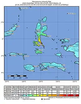 - 1 2 3 Wallansha, Robby (July 15, 2019). "Ulasan Guncangan Tanah Gempabumi Halmahera" (in Indonesian). BMKG. Retrieved July 24, 2019.